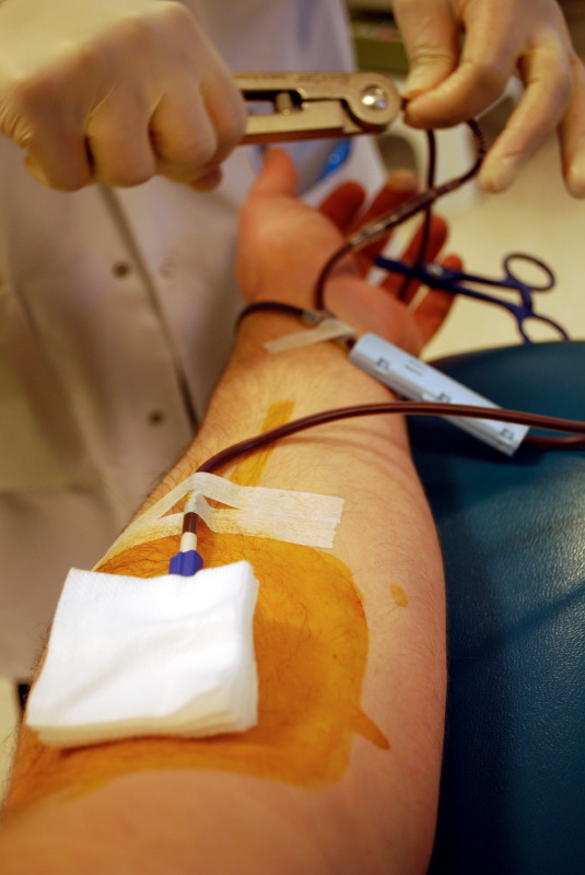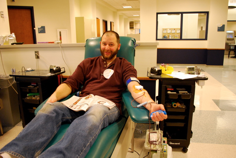 Yesterday I made my 50th blood donation at the Blood Center of WI. I’ve been doing it for years now and it’s an almost unconscious sort of habit….every two months, time to donate…makes me feel good, that’s for sure. It’s nice to do something for people I’ll possibly never meet. It’s simply nice to do something nice. To commemorate the day, I asked blood-tech, Natalia, to take my picture, and then I made a photo too, as she was finishing off my donation sequence.