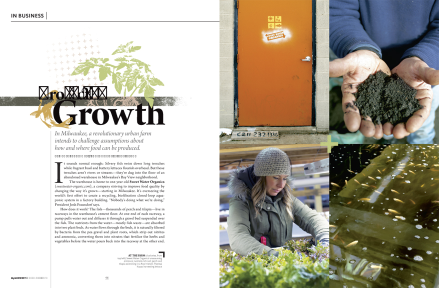 Here’s the lead spread from a story shot for the current issue of MyMidwest, the in-flight magazine of Midwest Airlines. It’s a story about local green business-start-up, Sweet Water Organics. It was a lot of fun to shoot and I learned a lot about the org’s efforts too.