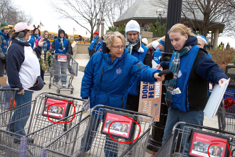 In this photo that I made at the Milwaukee Holiday Parade yesterday, title-sponsored by Johnson Controls, volunteers are depicted preparing shopping carts for the food-drive portion of the parade (by Hunger Task Force). In the shopping carts? A portrait of a local realtor (circled in red) that I made about a year or so ago! Nice to see my photos being put to work. 🙂