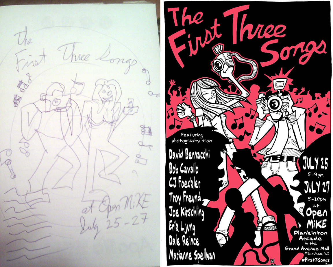 As a special treat to the first 50 people who come to the exhibit, there will be a special free poster give-away! This great poster was created by Matt Chic. This guy is so talented – look at the little sketch I threw together, and what he made from that! Amazing!
