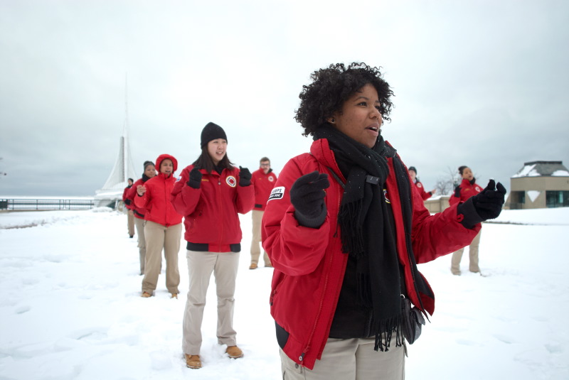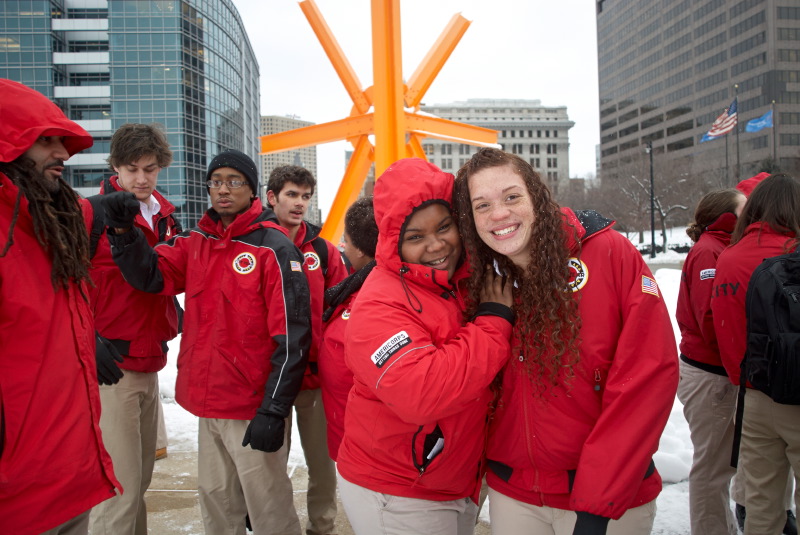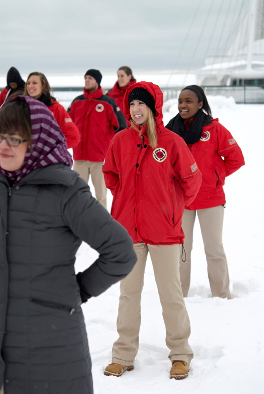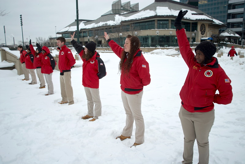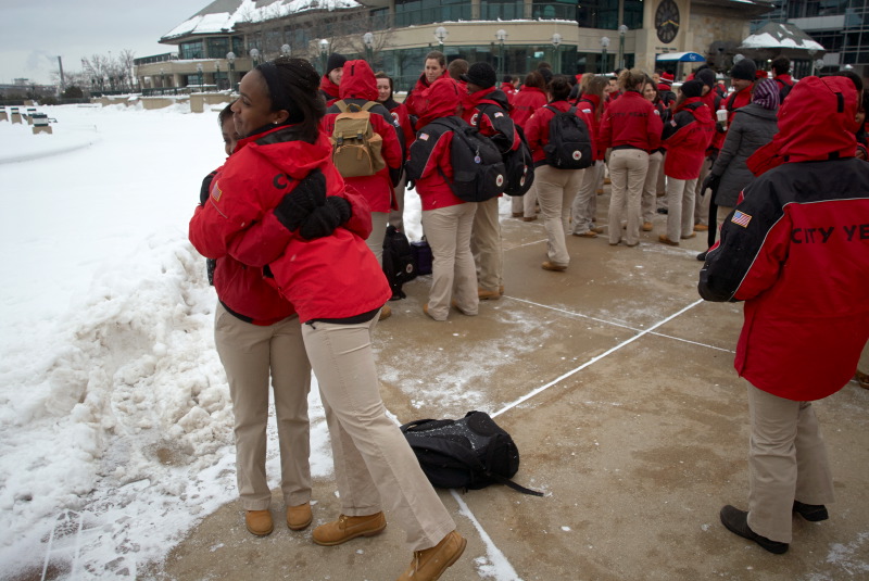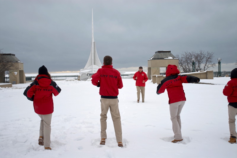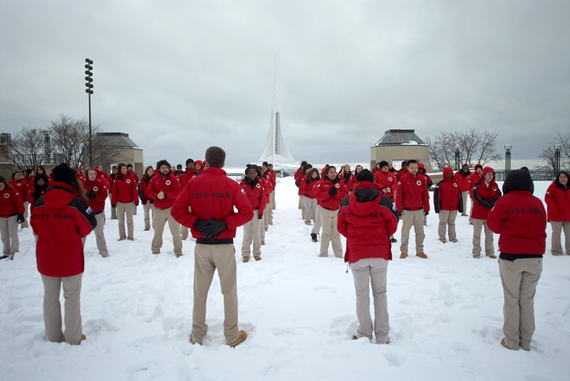 Every Friday, the City Year members meet in downtown Milwaukee for a weekly meeting and activities. Each of the school groups has a clustering with their group leader and receive news and updates. Then, as a whole, the corps participates in some physical training – on this day, that happened to be in 8 inches of snow! Their enthusiasm filled the air and it was exciting and energizing to watch them. Seeing these people reaching out to serve in the Milwaukee community makes me feel very confident for their futures, and for the future of Milwaukee!