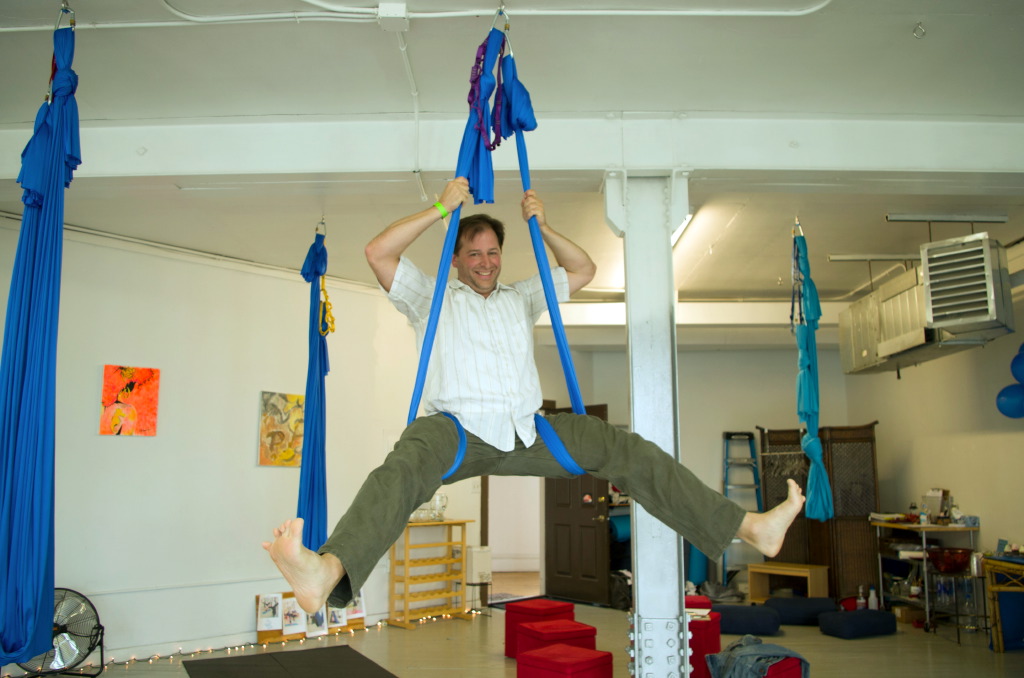 Not everyone feels comfortable doing “regular” yoga. Maybe they don’t feel flexible enough, or don’t like being on the ground, or don’t think they are capable of doing the stretches. As I learned, aerial yoga can be an attractive alternative. Releasing your body from the bounds of the ground, allows you to stretch and strengthen your muscles in different ways. Hanging in the fabric, you can use gravity itself to help you stretch further. It’s really pretty dang neat!