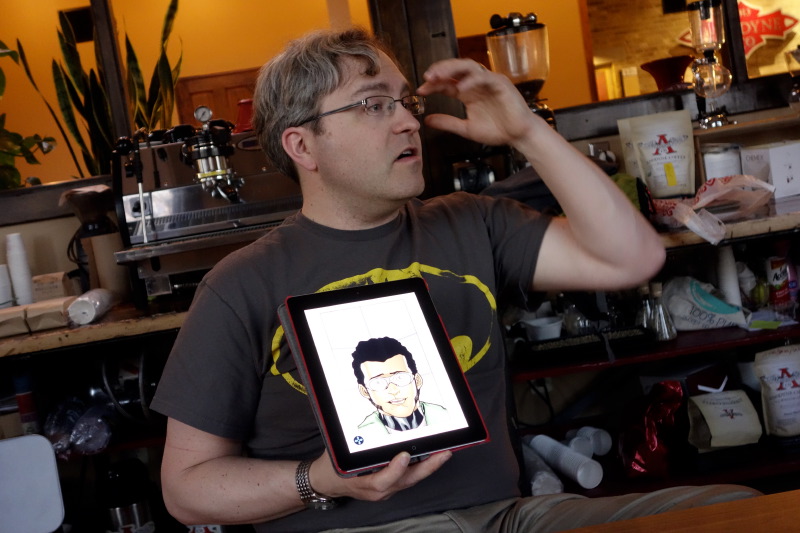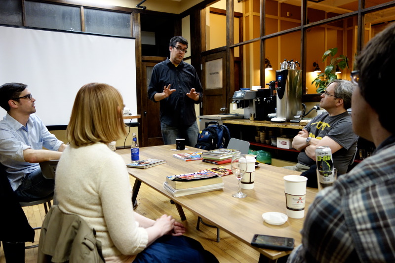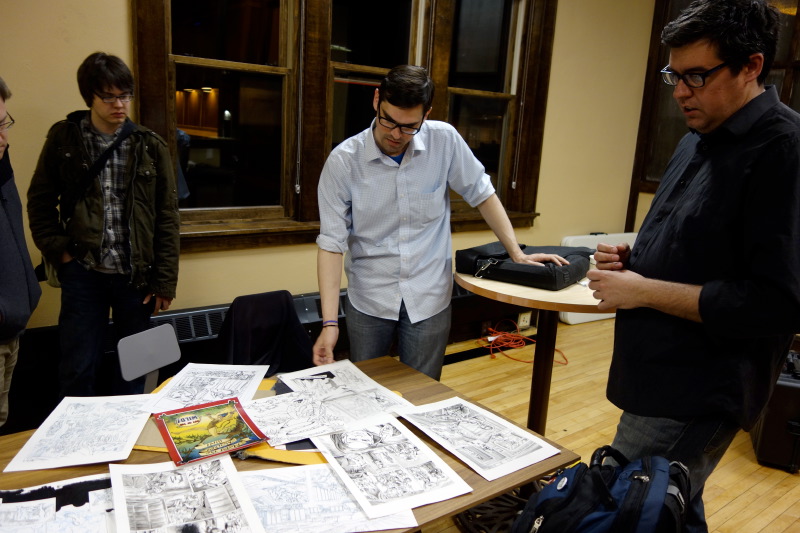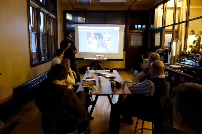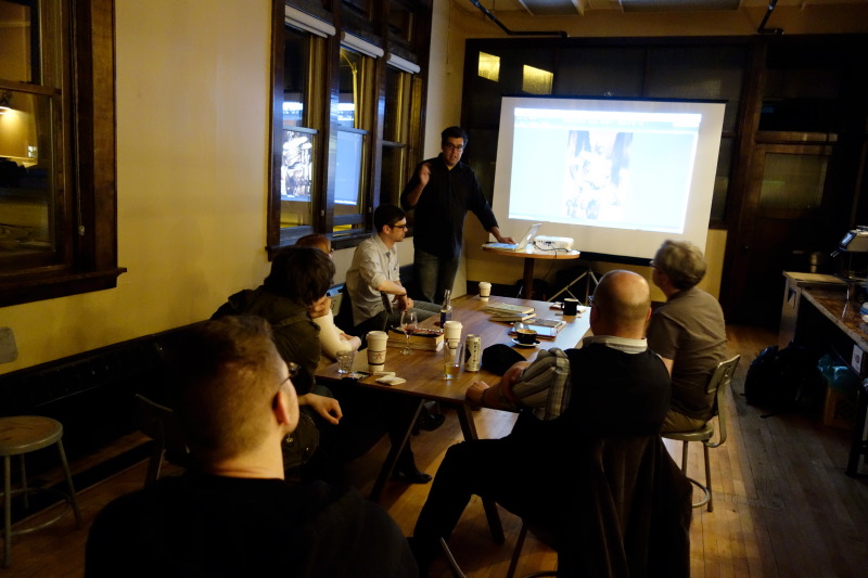 This month’s MKE Comicbook meet-up at Anodyne Coffee was another interesting evening. This evening we had two great topics to share in. As comicbooks have a recognizable history of taking on various social/political issues, attendees were invited to bring comics they prized, that dealt with a particular issue. We also took time to talk about sexism and some of the very, very poor behavior in the world of comicbook fandom against women comicbook fans – particularly how it needs to be spoken out against and how that sliver of the culture needs to be shown the error of its ways. After an hour’s discussion on those topics, author Tea Krulos gave a presentation on the writing of his book about the “real-life super-hero movement” – “Heroes In The Night“. Artist David Beyer Jr. also stopped by to share some artwork from a graphic novel he and Tea are working on. It was a VERY interesting evening and I really appreciate everyone who came out for it!