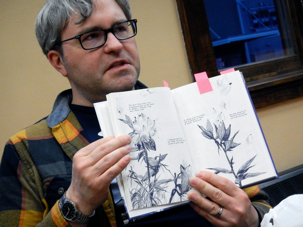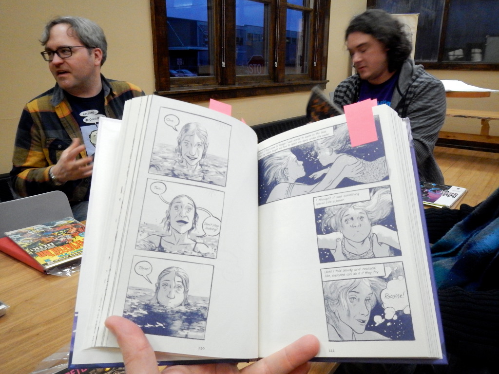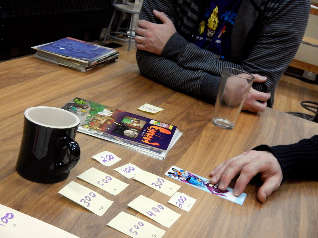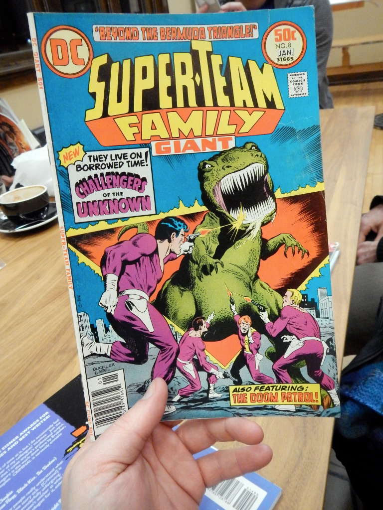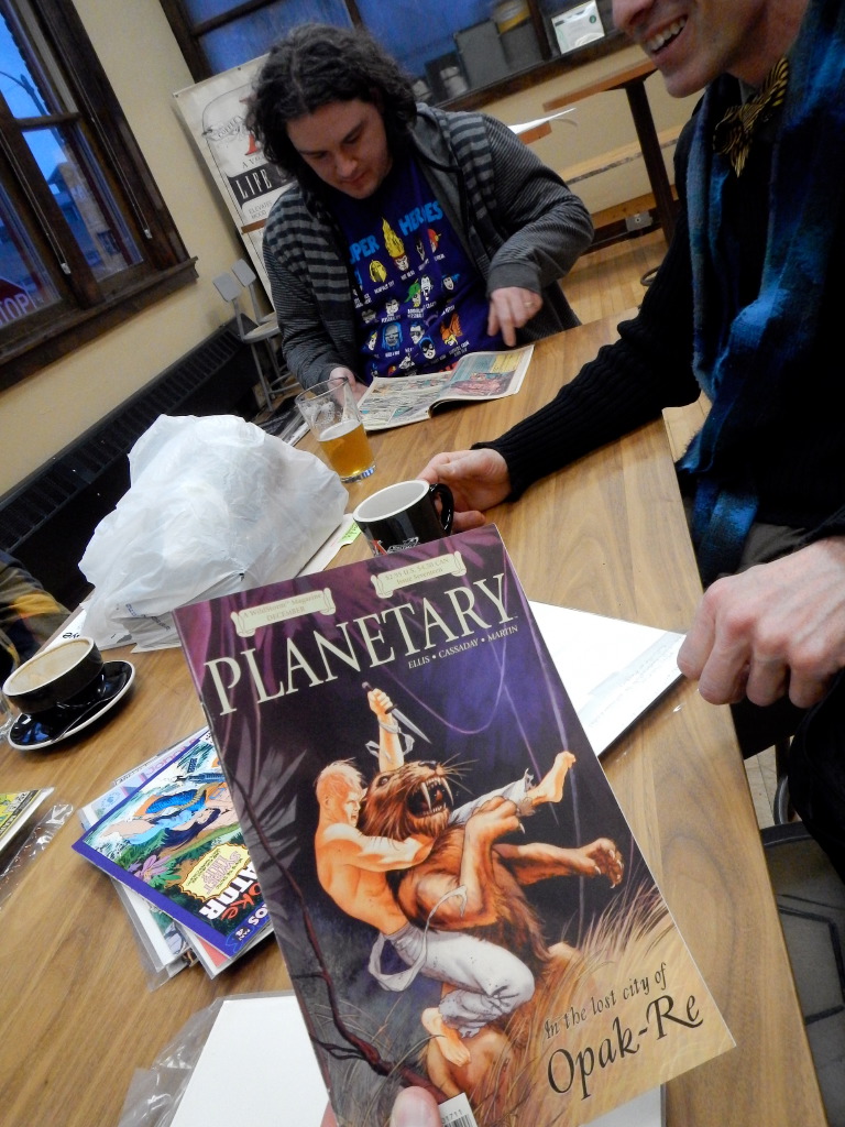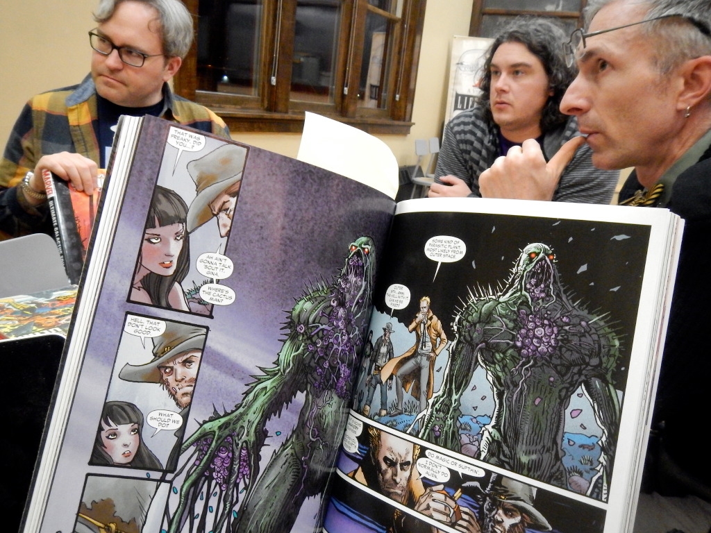 Shawn brought a cool variety of books. The current Black Science, written by Remender, and featuring parallel-universe traveling had a scene featuring giant tortoises with Aztec temples on their backs, trudging through a purple-hued lightning storm! He also brought All-Star Western Vol 5, which featured an appearance by the garishly-green Swamp-Thing and wish-granting, purple-tinted Black-Mercy Flower. His volume of Black Panther: Four the Hard Way had in its pages the previously-mentioned Galactus, but this planet-eater was actually zombified Marvel superheroes! His final book to include was Chew Vol. 1, wherein the detective hero’s favorite food happens to be beets!