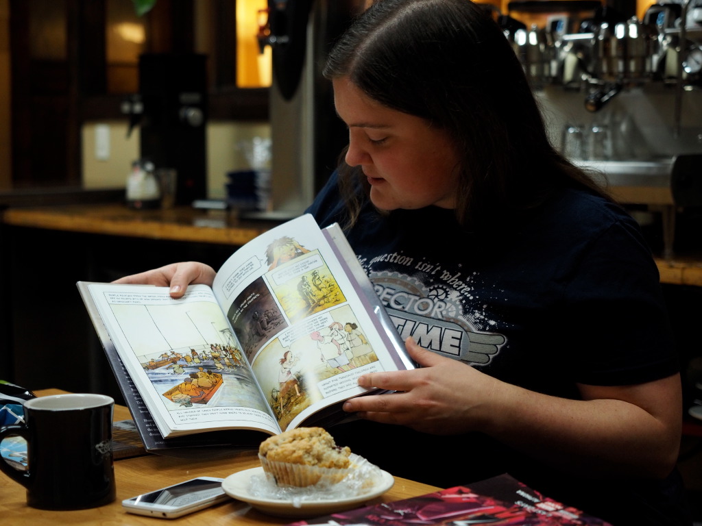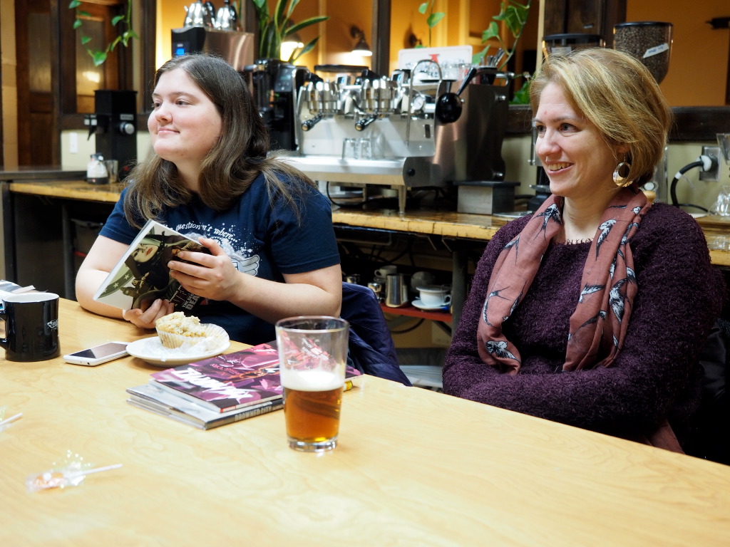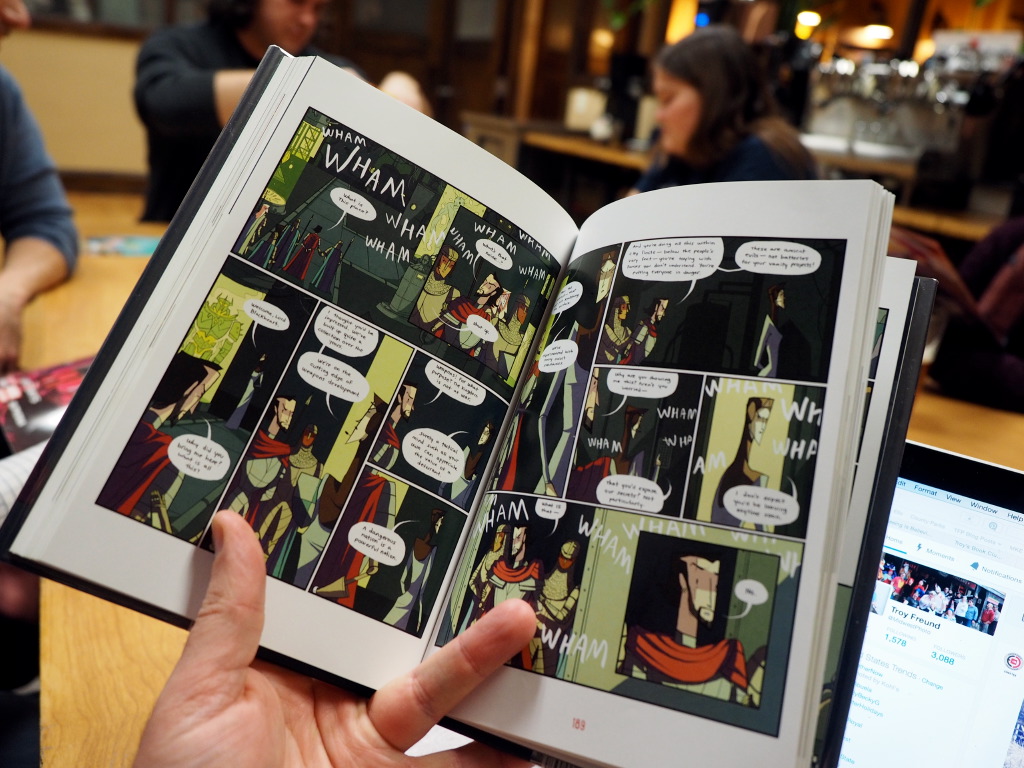 We started our talk off with a comment Kate made about comicbook stores: “I can find them intimidating…which I haven’t felt when going to a bookstore.” This really spoke to an issue in the industry right now – women are the fastest growing readership in comics, yet because it was traditionally a guys’ thing, many comicbook stores are struggling to make the in-store browsing/shopping experience a good one for women and especially, new-to-comics-reading women. So let that be a heads-up to our MKE stores — start some women-centric outreach! Comicbooks aren’t just a guys’ thing!