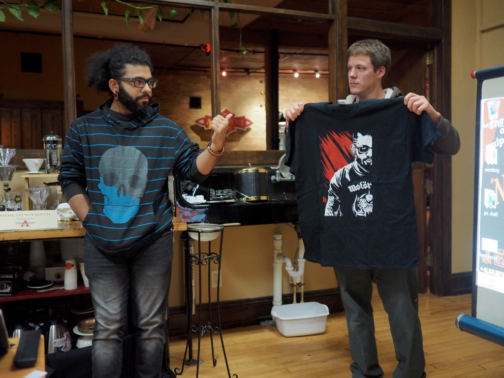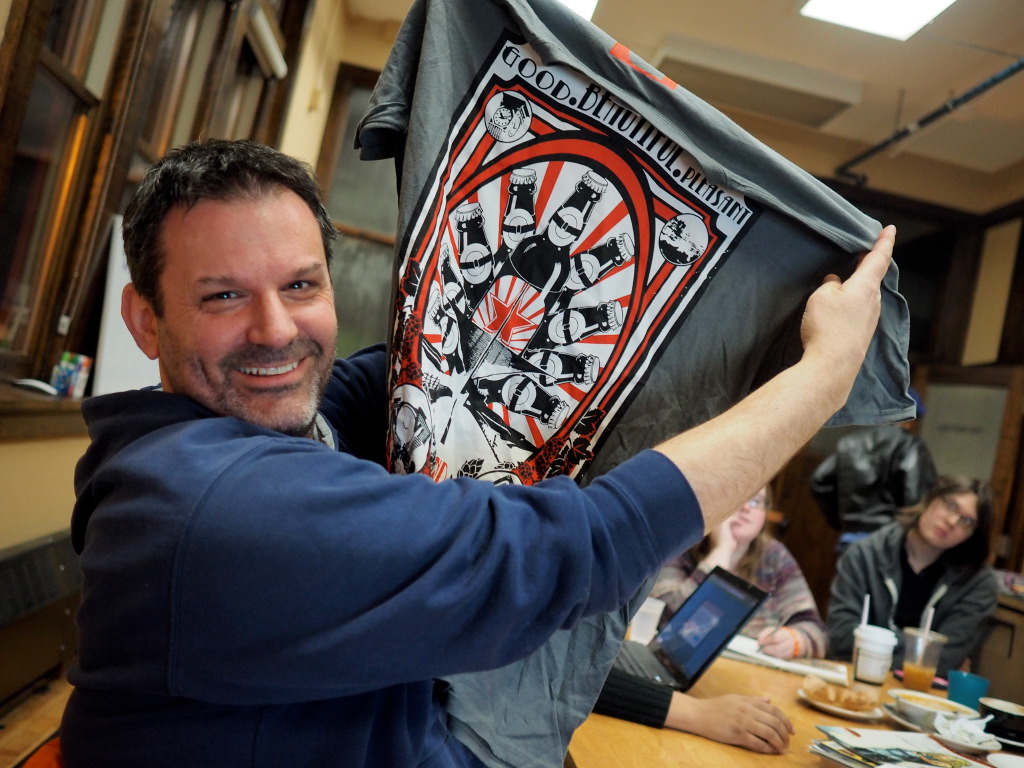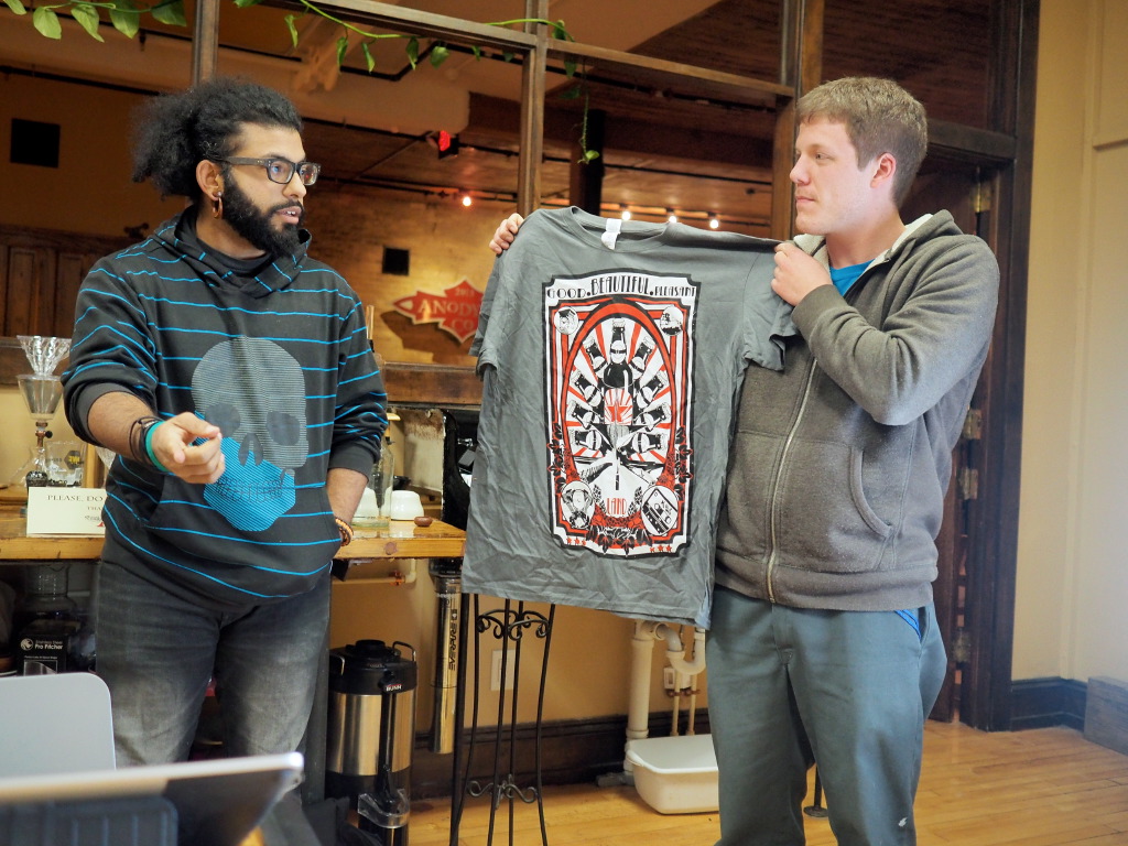 I learned of their company this past November at the Local First Milwaukee “Buy Local Gift Fair”. I talked with them at their booth, remarking on how comicbook-ish the art on their shirts seemed, and was delighted to learn that Rob was actually in the process of producing his own comicbook! As soon as I learned that, I knew they had to come to MKE Comicbook.
