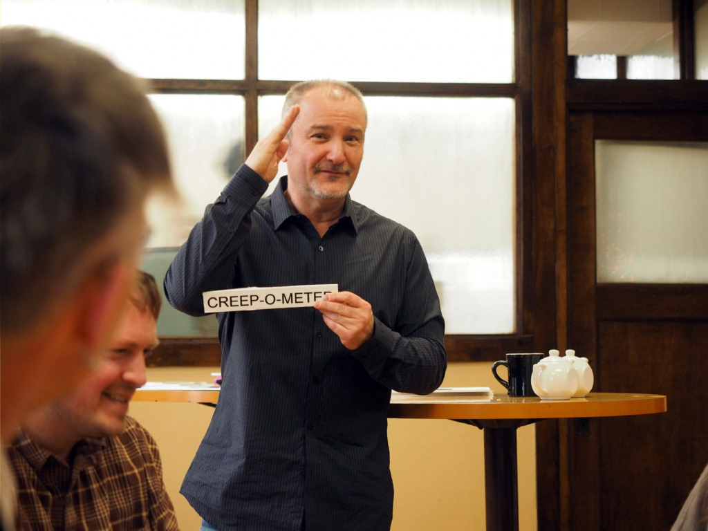 Our presenter was Mark Bradford. He’s been a longtime-attendee of MKE Creatives, and is a gent of many passions. While he mainly works in web development and IT support for small businesses, he’s also created an online dating website, a puzzle site, has started writing fiction, makes YouTube videos, and oh yeah, created a Theoretical Bank in order to reverse-engineer how banks work (and it was so convincing, the fake-bank was attacked by foreign hackers who thought it was a real online bank). His latest effort is a coaching program, to help people find better balance in life.