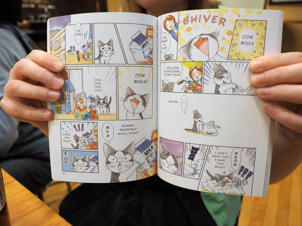 Emilio had a theme of his own this evening – kittens and ramen. He brought in “Neko Ramen” – a manga about a bossy cat that runs a ramen restaurant. His second manga was “Chi’s Sweet Home” another manga about an adorable kitten.