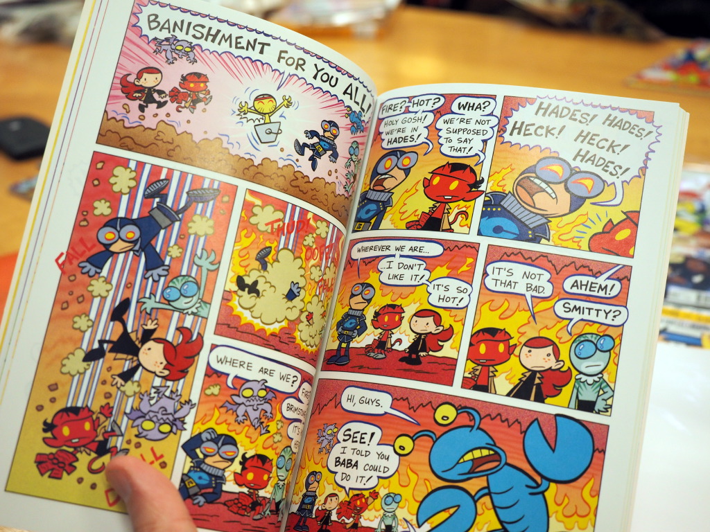 There’s been a trend towards making comicbooks more kid-friendly by making the actual characters into kids – X-Babies, Tiny Titans, and – Amber’s most favorite – “Itty Bitty Hellboy”. As she put it, “I love Hellboy in general, and when this came out, I lost my mind!” One final book she brought followed this concept and was the every-so-lovingly illustrated “Study Hall of Justice.”
