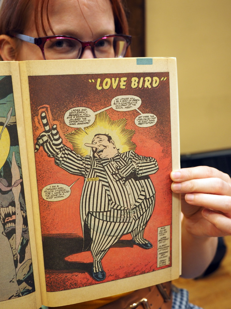 The third version of Batman’s villain, Clayface, fit with the card “villains in love” for his story where he falls in love with a mannequin (there’s also a Penguin story that uses ALL the bird puns you could imagine).
