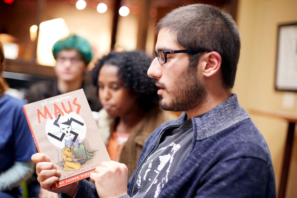 Jihann shared the classic Maus Vol. 1 and 2. For those unfamiiar, Maus is a Pulitzer Prize-winning biographical graphic novel that the creator, Art Spiegelman, made about his father’s experience in the concentration camps of WW II. In this book, though, the Jews are shown as mice, and the Nazis as cats.
