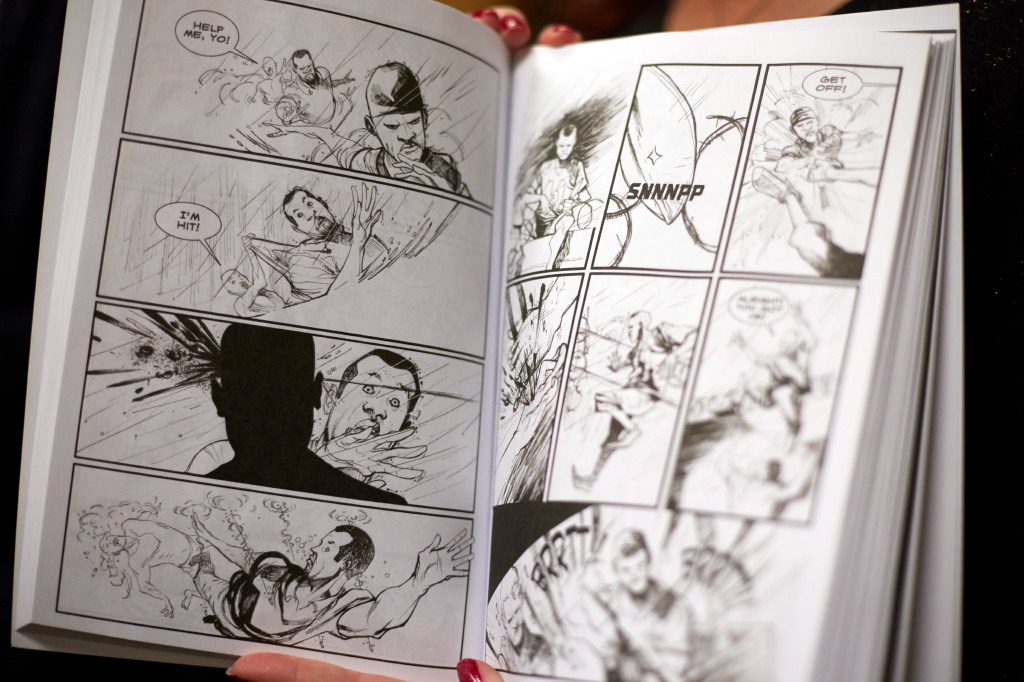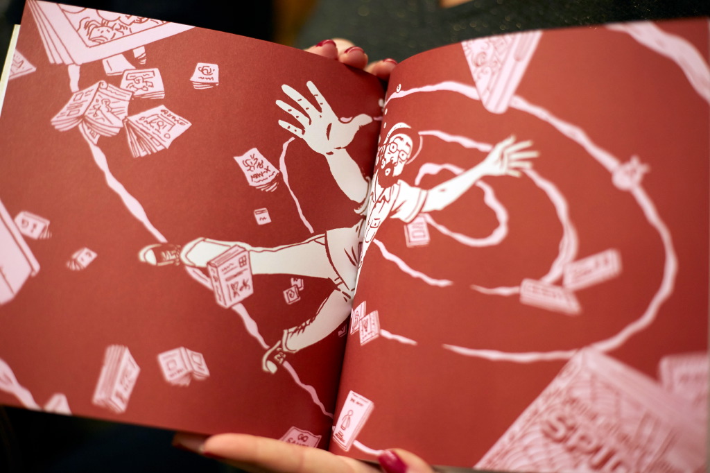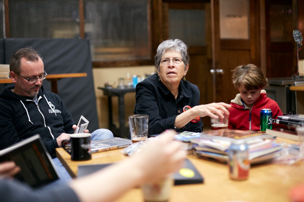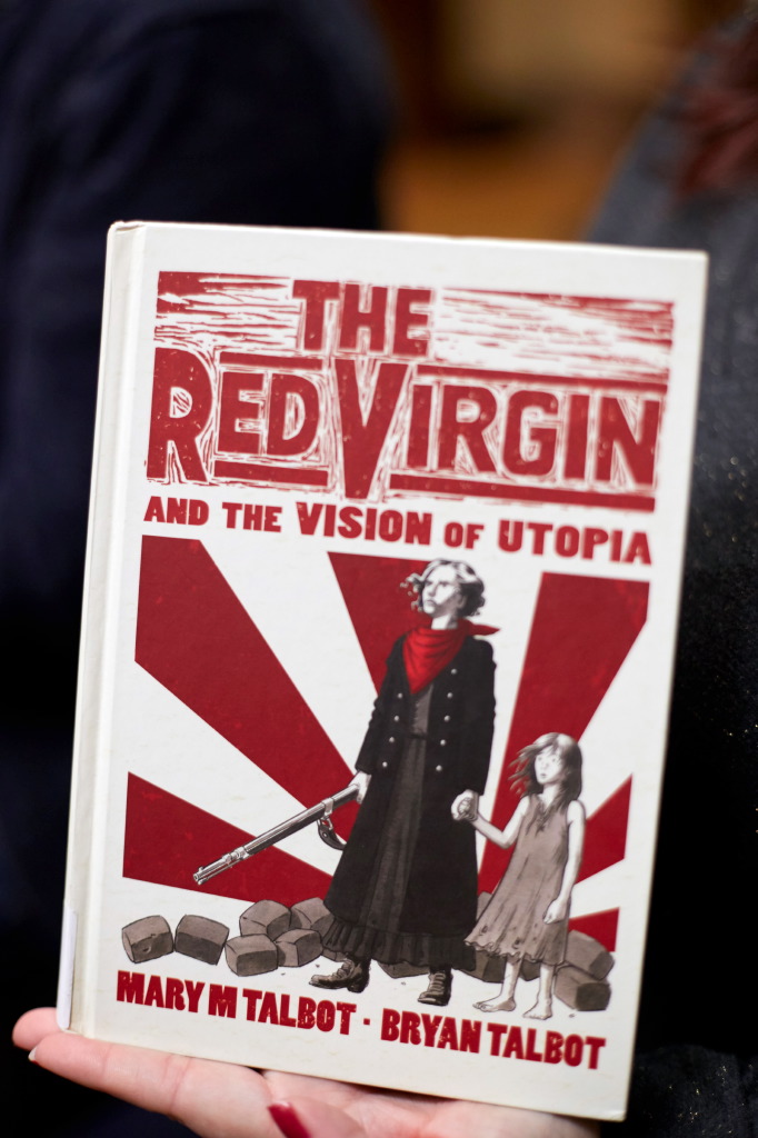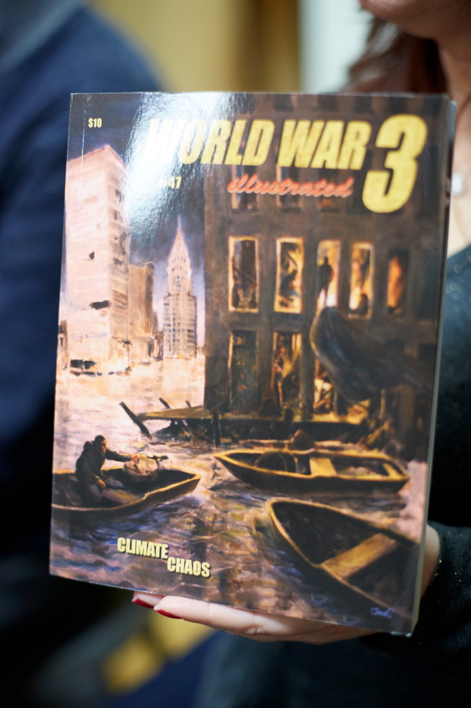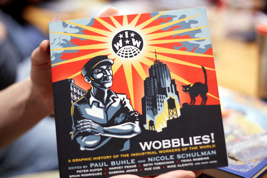 Sue, who has been a political cartoonist and editor since the 1970s, brought WW III Illustrated – an anthology that she is one of the editors on. It’s a magazine that works with an international lineup of creators and has been publishing since 1979! She also brought WOBBLIES, another anthology, where she illustrated a story on the history of free speech. She remarked on her career, “Since you don’t make money doing political comics, particularly as a woman doing political comics, in 1967…I worked as a school nurse (to make a living).”