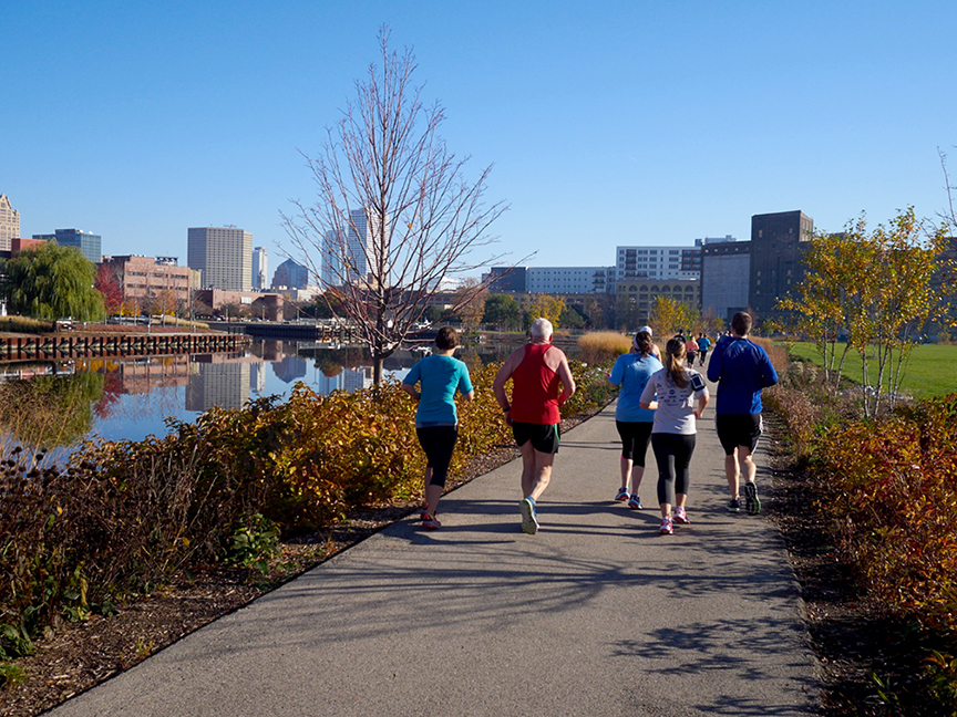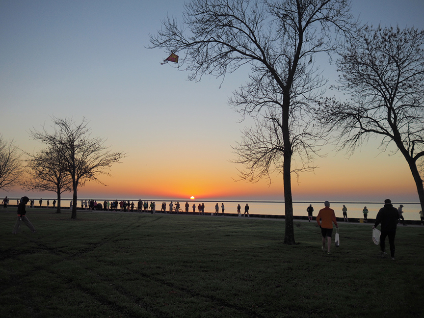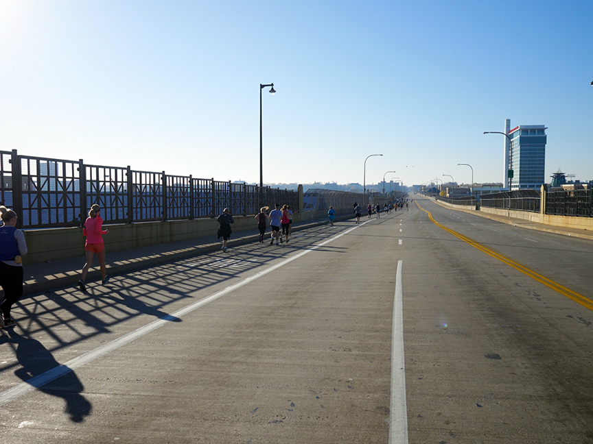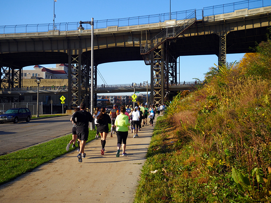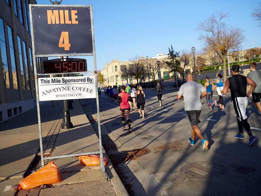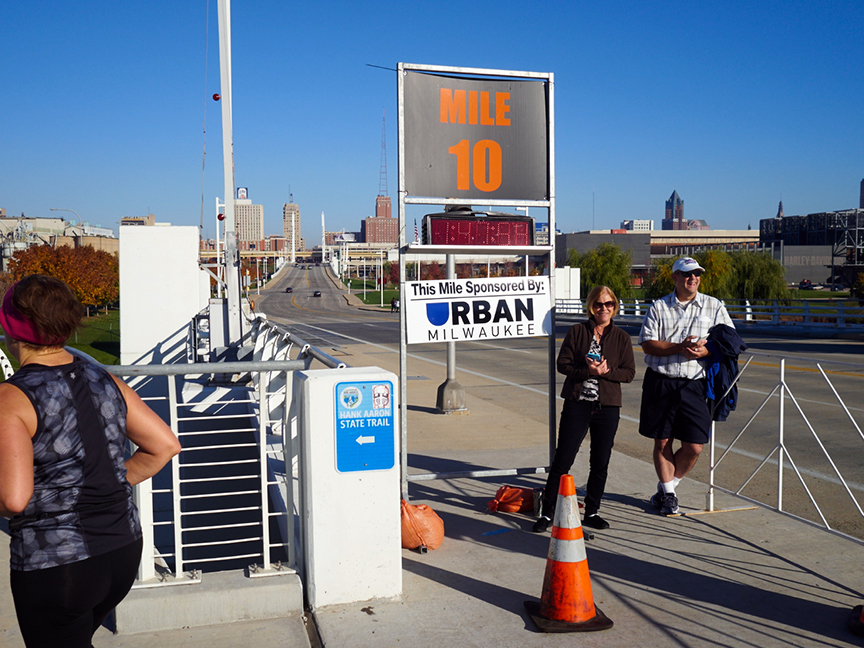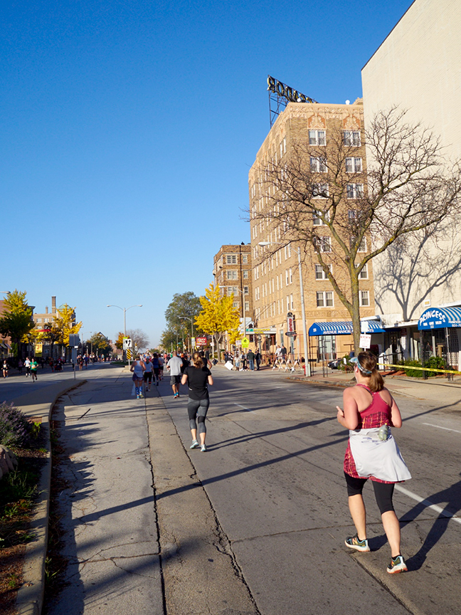 The race got started and it was pretty swell, jogging all around the city – from the lakefront, through the east side, on Brady St., through part of Riverwest, down Wisconsin Avenue…yep, it was a real nice course, seeing lots of Milwaukee. I ran alone most of the time, but also had a few stretches of running and chatting with some other runners. It was a real dang nice day for it!