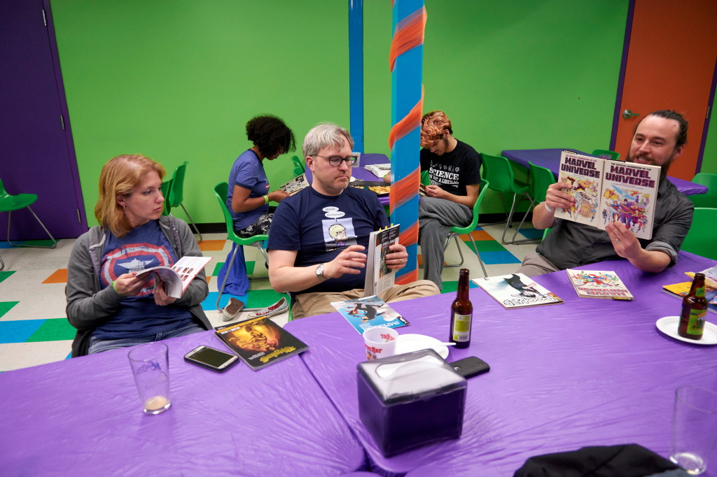 The April MKE Comicbook meetup was focused on a theme of “redemption.” Before we started sharing our books, we discussed the theme of redemption in comics a bit. I find it pretty darn interesting that, for heroes, in order to have a “redemption tale”, they first have to actually fail as a hero. For instance, the very name of a group of heroes as “Avengers” must make the assumption that something needs avenging, suggesting that the “bad guys” did win – at least one time. As was mentioned, “So many origin stories were based in a hero failing, and then having to redeem themselves,” and “my mind went to heroes who were once villains…like Hawkeye, and his brother Swordsman…”