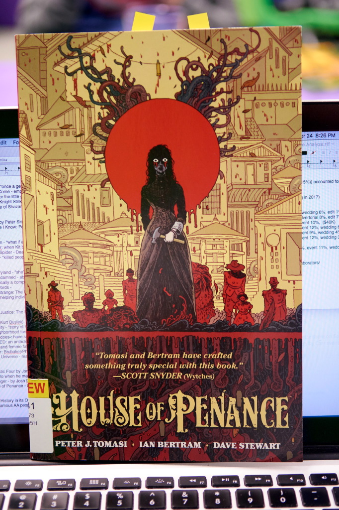 I shared Christos Gage’s ABSOLUTION, a story about a hero who becomes a serial killer, and does >not< seek redemption. Another book I shared was HELLBLAZER, which I realized wasn’t quite such a redemption tale, as it was a “hit rockbottom and save yourself” story, when John’s girlfriend broke up with him.
