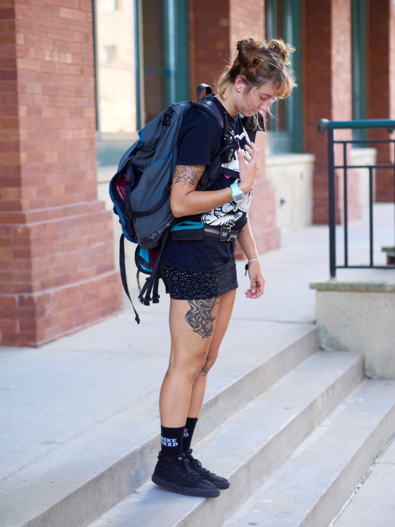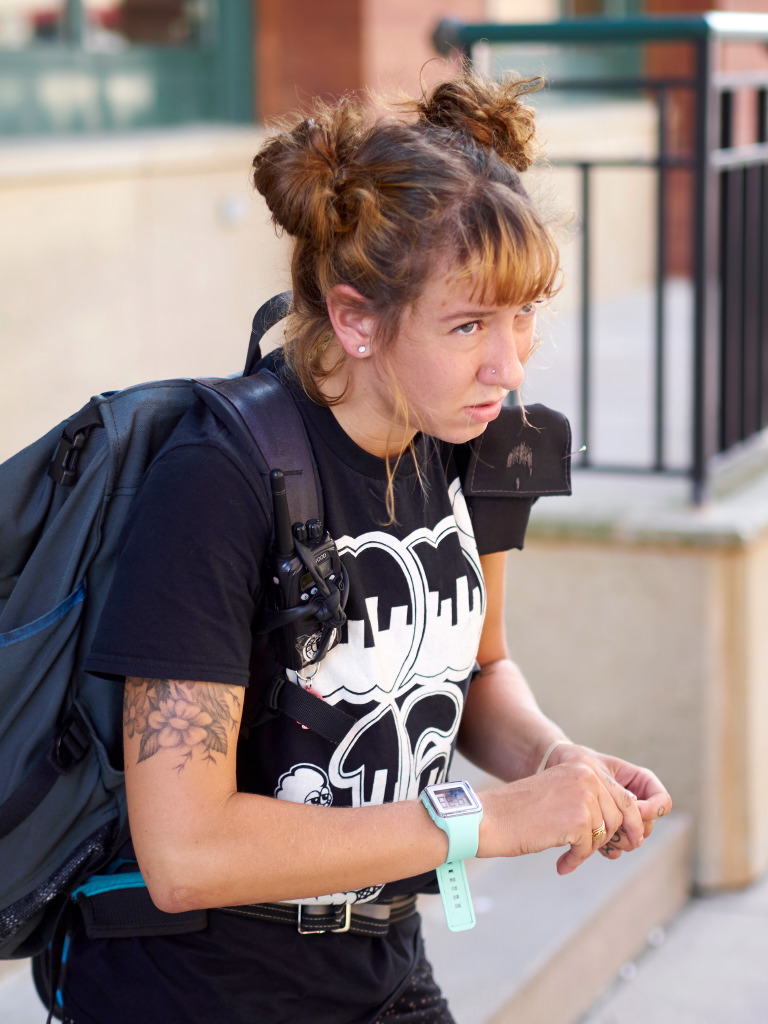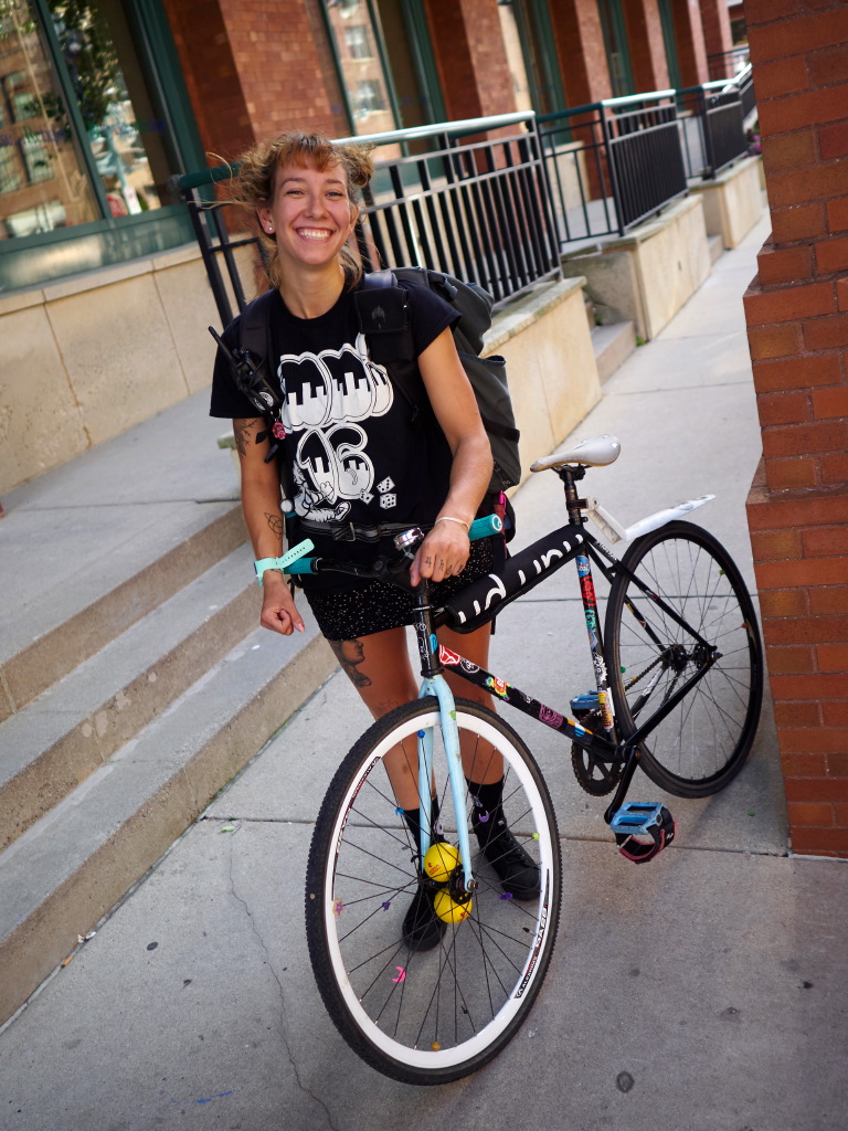 Sunny’s been a bike-messenger about two years, and only actively biking for about 3-4 years. She got into biking while attending college in Missouri on a Division One full-ride soccer scholarship. She didn’t want to pay for parking, and a friend got her rolling on two wheels. She quickly developed an affection for the mechanics of how bikes work (and worked in a bike-shop), and then really came to love the “bike culture.” She was part of a small group of people in her town who actively biked, but it was big enough that she and some friends started a bike-polo group!
