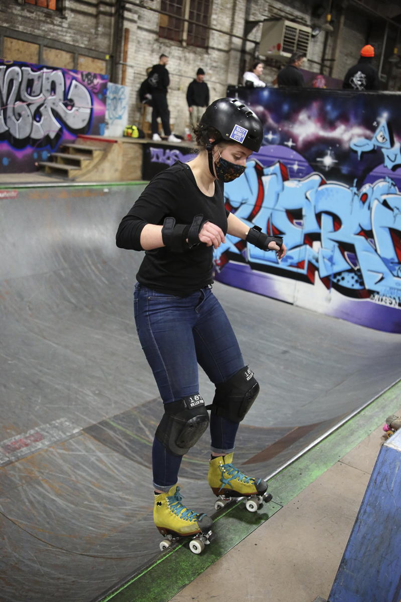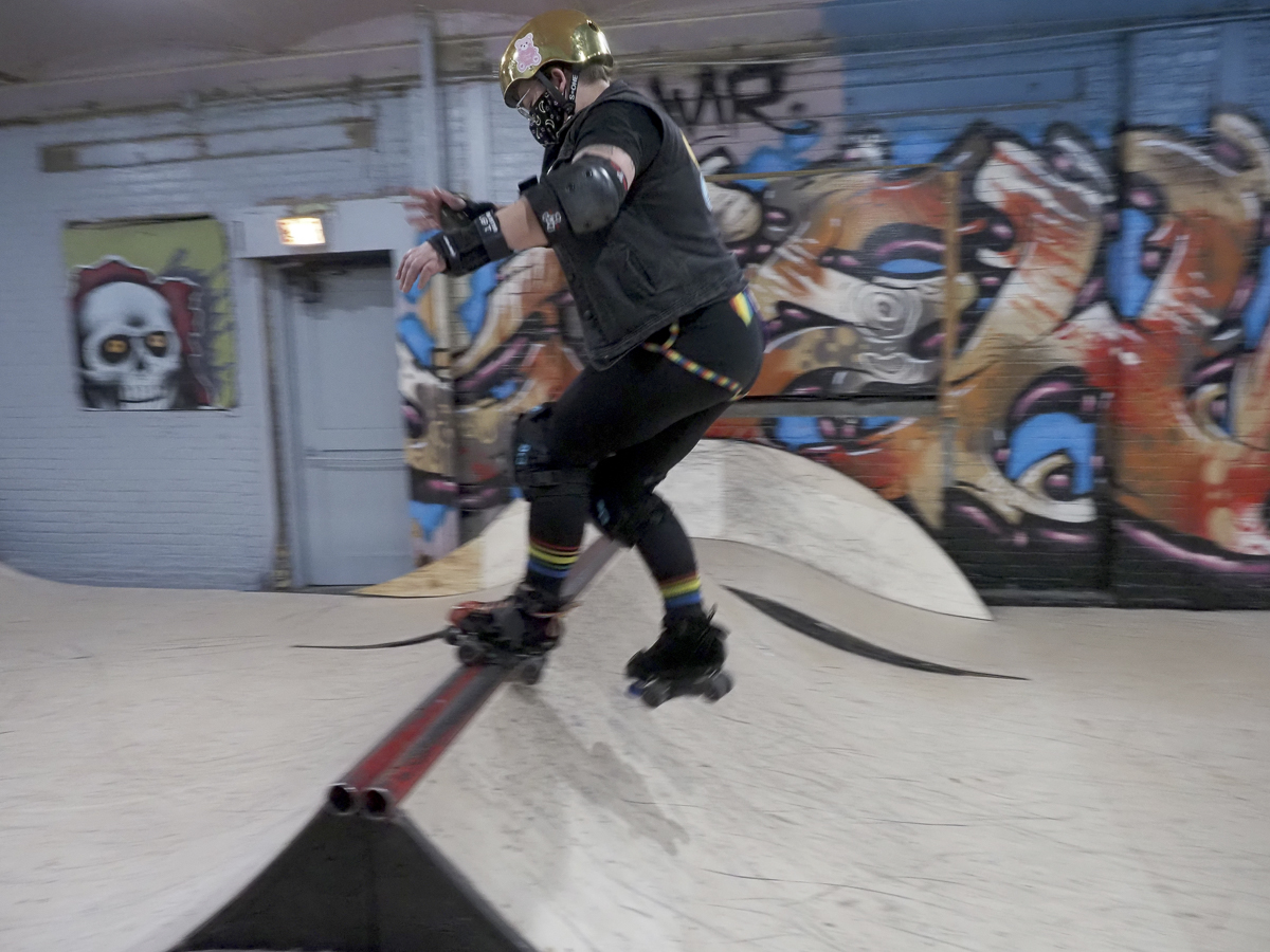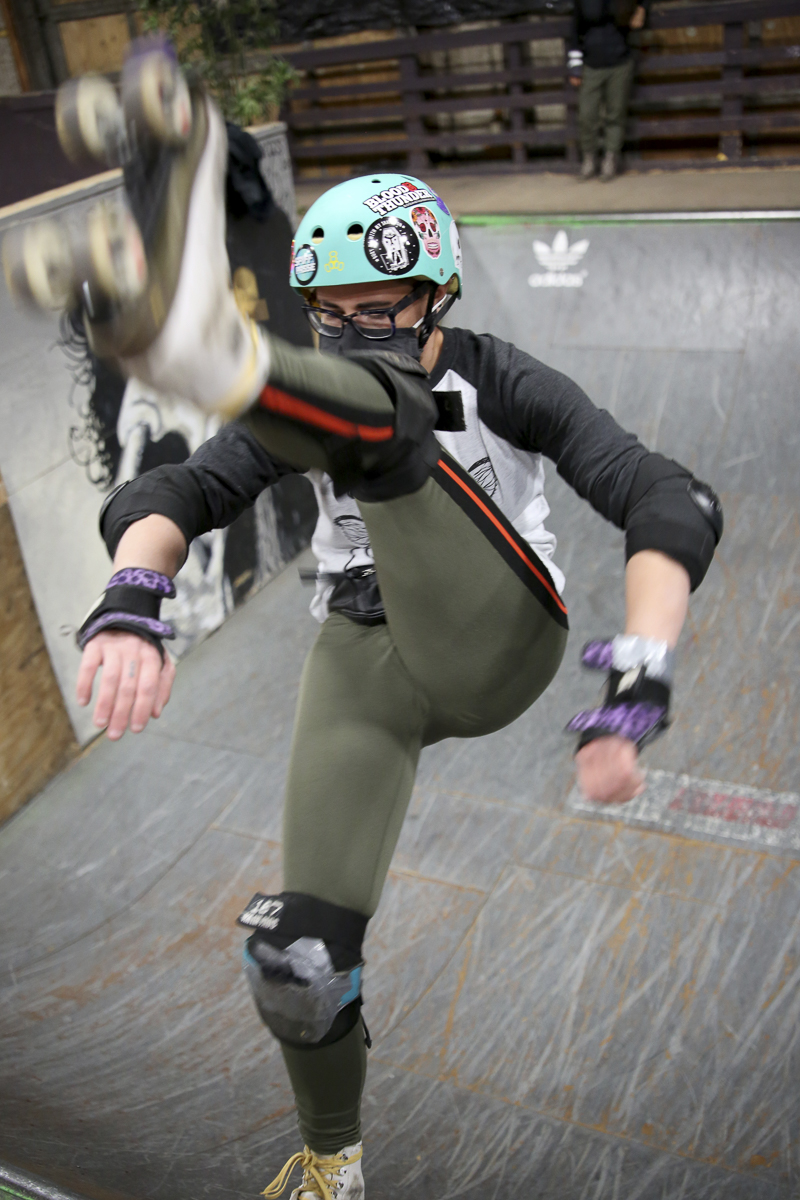How old are you? How long have you been rolling? I am 36 years old. I roller-skated as a kid, lots of birthdays at the roller rink. But in early 2019 I started skating derby, just recreationally (bootleggers), not on a team. Once COVID hit (Spring 2020), derby shut down. Then I was just trying to get in trail skating. In June, I went to 4Seasons’ first Queer/Femme night and by the end of July, I was OBSESSED with aggressive/park quad skating.